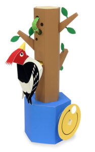 ハンドルを回すとキツツキとイモムシが終わりのない攻防を繰り返します。